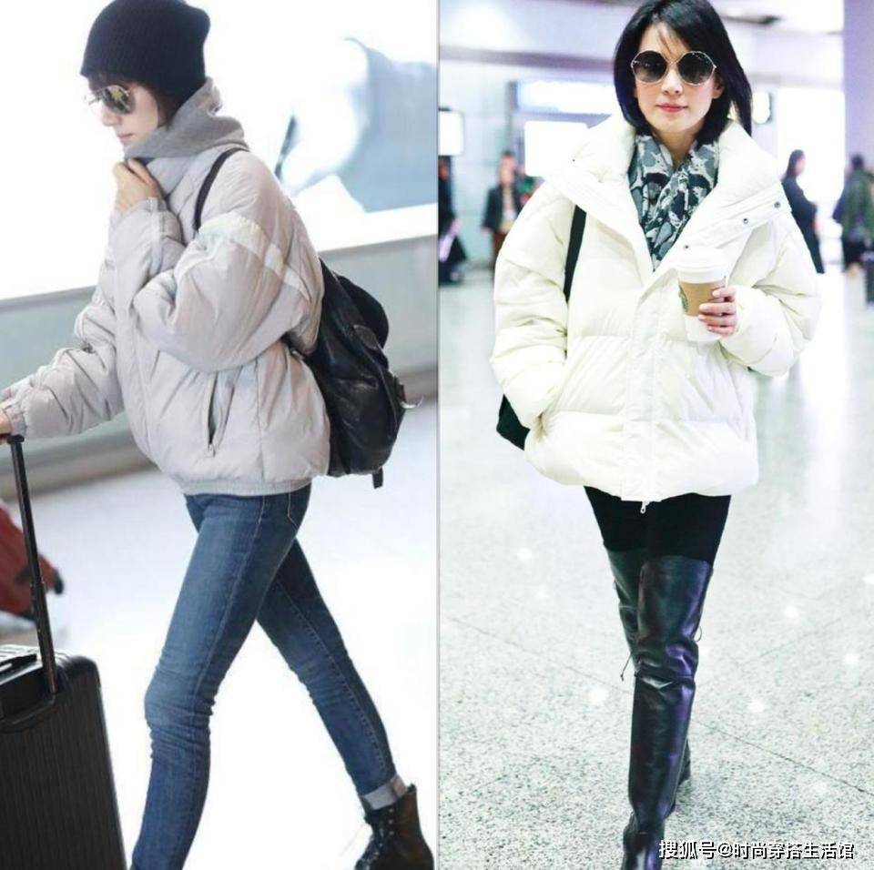 穿短款羽绒服时,搭配的靴子的长度,直接影响着腿长和身材比例。俞飞鸿身穿黑色羽绒服,下半身搭配小黑裤,“上松下紧”造型有利于修饰腰臀位置,对身材起到“扬长避短”的效果。长筒靴的加持,进一步完善了腿部塑形,视觉上更显高。