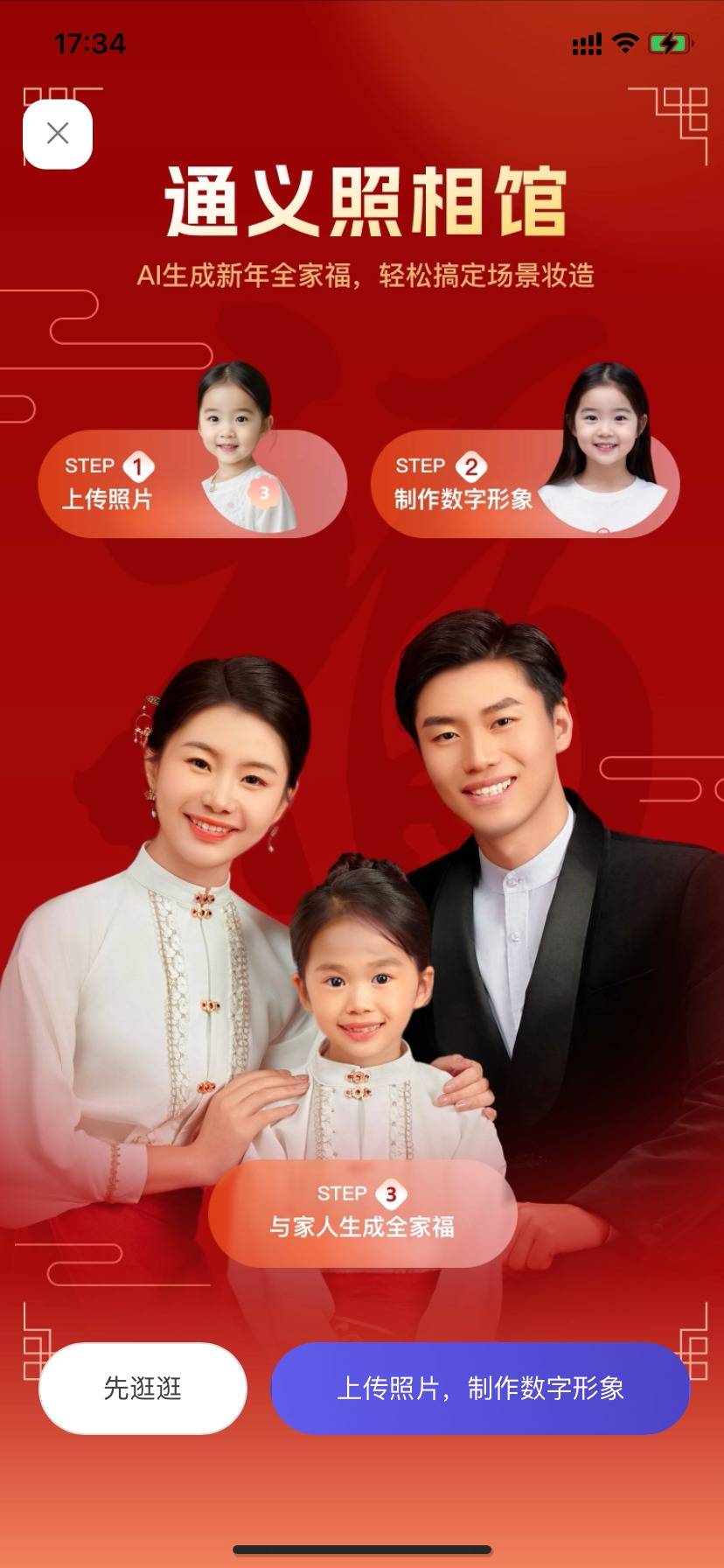 随着春节的临近,阿里旗下的AI产品通义千问 APP 推出了一系列免费的新功能,如拍全家福、拜年、画龙、创作春联等等,300套照片模板,用户上传照片即可生成全家福、团圆照、拜年照、千里江山主题照等。