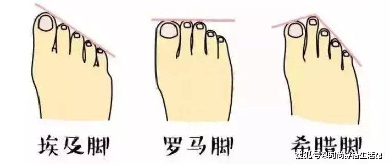 咱们亚洲人大部分都是埃及脚型,这种类型的脚也是最好挑鞋子的,斜头和圆头的鞋都很合适。罗马脚看起来就更趋向方形,所以最适合的鞋自然也是方头鞋。希腊脚的第二三根脚趾会偏长,穿杏头鞋和尖头鞋会更舒服。