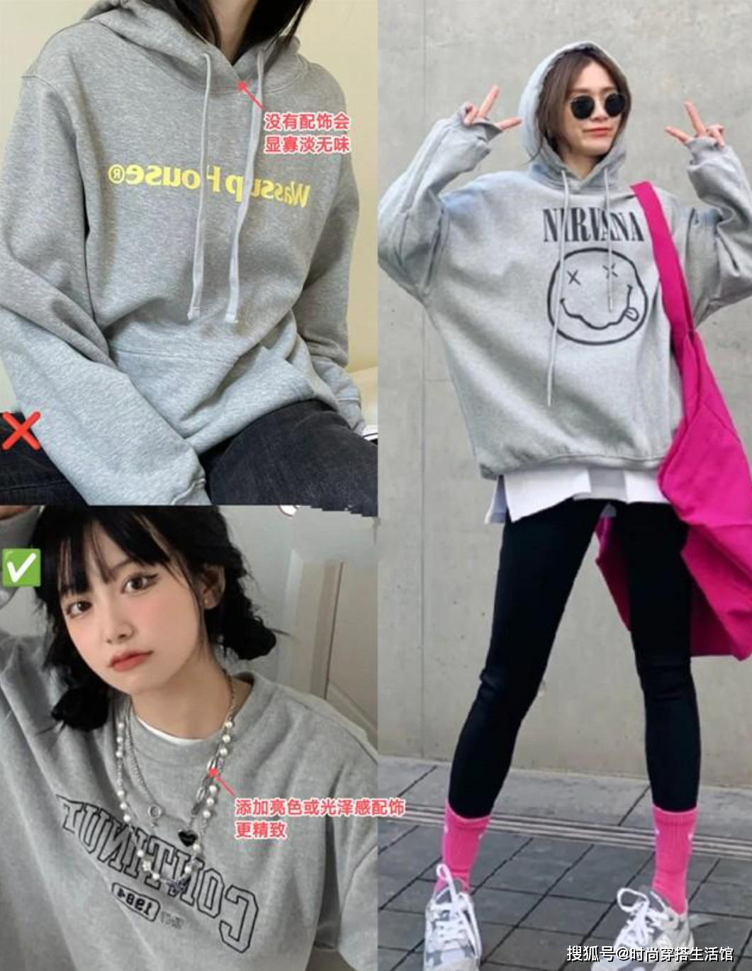还可以从配饰上入手。但别选设计太普通、太低调的配饰,用有光泽感、亮色或设计特别的配饰搭配才能脱颖而出。亮色和光泽感配饰在灰色卫衣这类型设计基础、颜色偏暗的单品上效果尤为突出。彩色配饰可多处呼应,光泽感或金属配饰选择叠戴更高级哦~