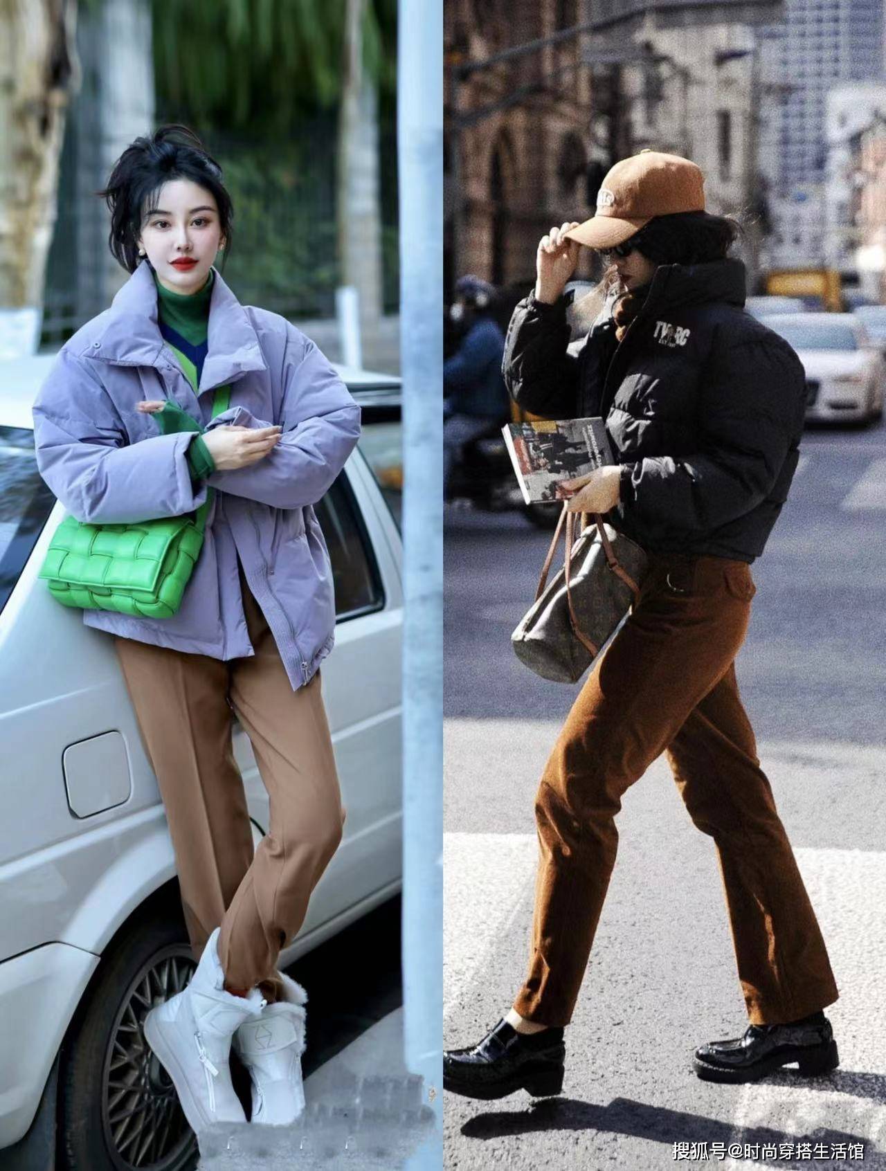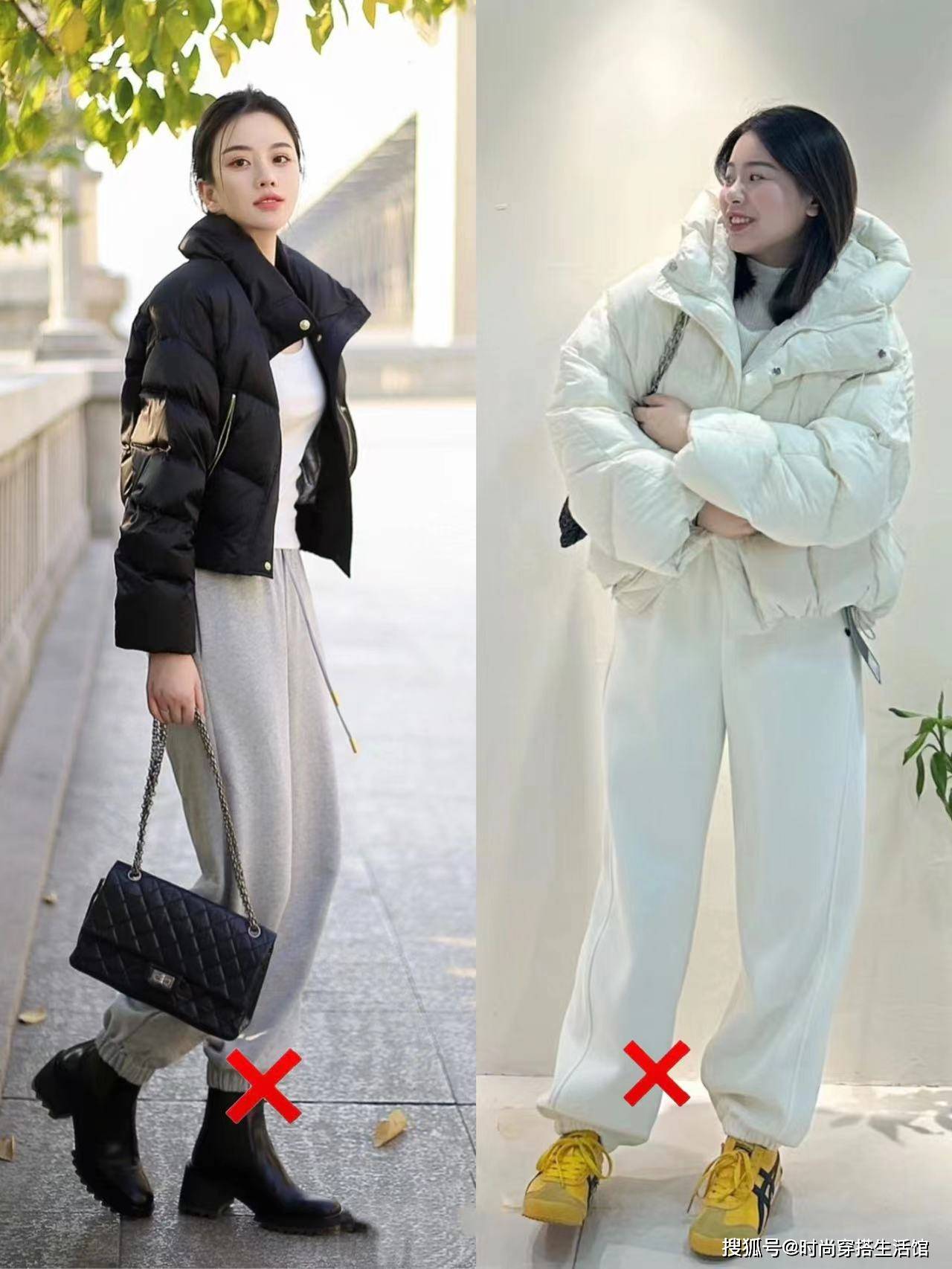 卫裤显土的第二点原因,在于他是一款运动风格的裤子,本身款式比较休闲,穿着风格也比较固定,而羽绒服和大衣的风格是较为淑女和正式的设计,两种单品的风格不一致,导致整个穿搭的融合度不高。