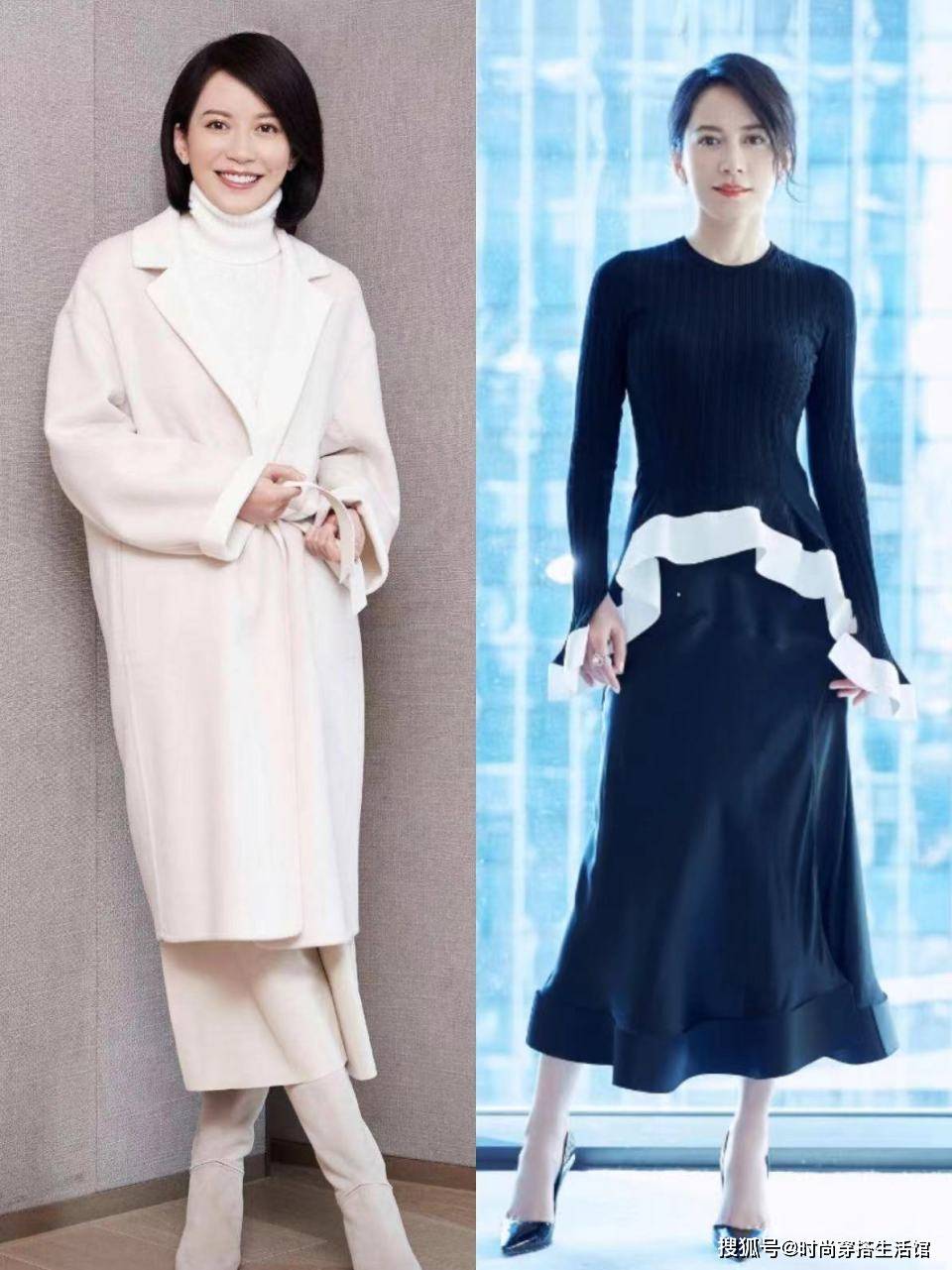 同色系穿搭是最为高级又懒人的方式,俞飞鸿也巧妙的利用了这一方法,白色风衣+白色高龄毛衣+宝色半身裙+白色长筒靴,一身都是白色非常简洁干净,越看越高级,利用内长外短的搭配来增加层次感,衬托个人的穿衣品味。