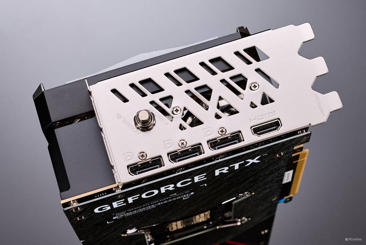 在视频接口的旁边还有一颗按钮,其实这是BIOS切换按钮。iGame GeForce RTX 4080 SUPER火神显卡自带两个不同的BIOS,其中一个主频与RTX 4080 SUPER FE看齐,为2550MHz,TURBO版BIOS主频默认可以来到2640MHz,实际测试中约在2800MHz左右。