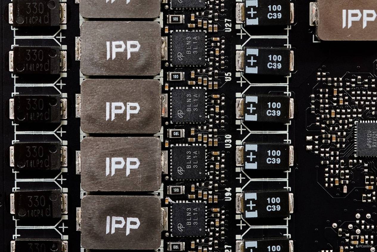 供电控制芯片采用了三颗,分布在PCB的正反面,分别是:uP9512U、uP9521R,以及uS5650Q。其中uP9512与uP9521共同管理核心供电,可以做精细化的供电管理。