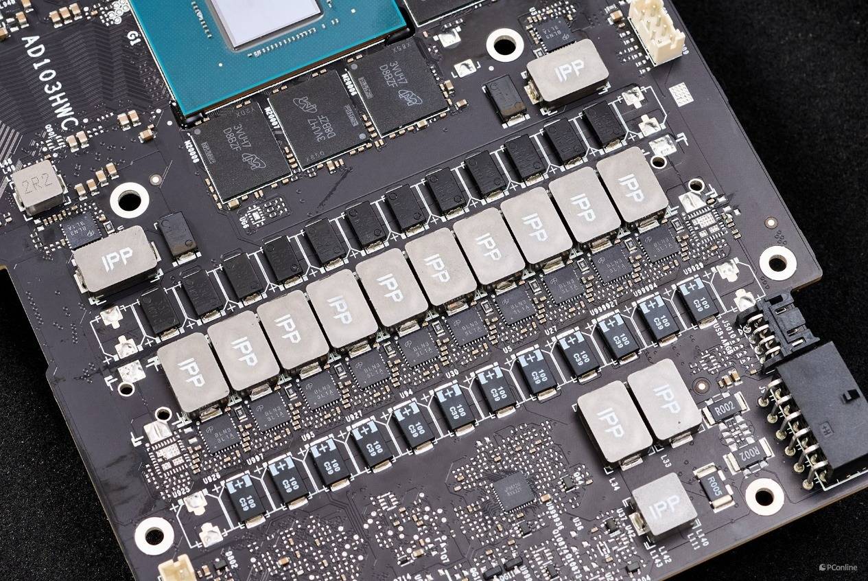 PCB中央的AD103-400-A1核心就是本次的主角,TSMC 4N工艺打造,10240个CUDA流处理器,就是目前顶级的AD103芯片,规模也比之前的RTX 4080高了5%,想必其性能也有不小的提升。