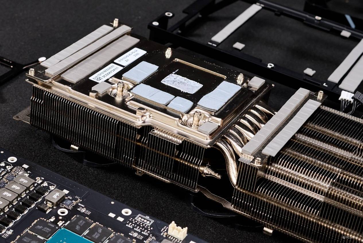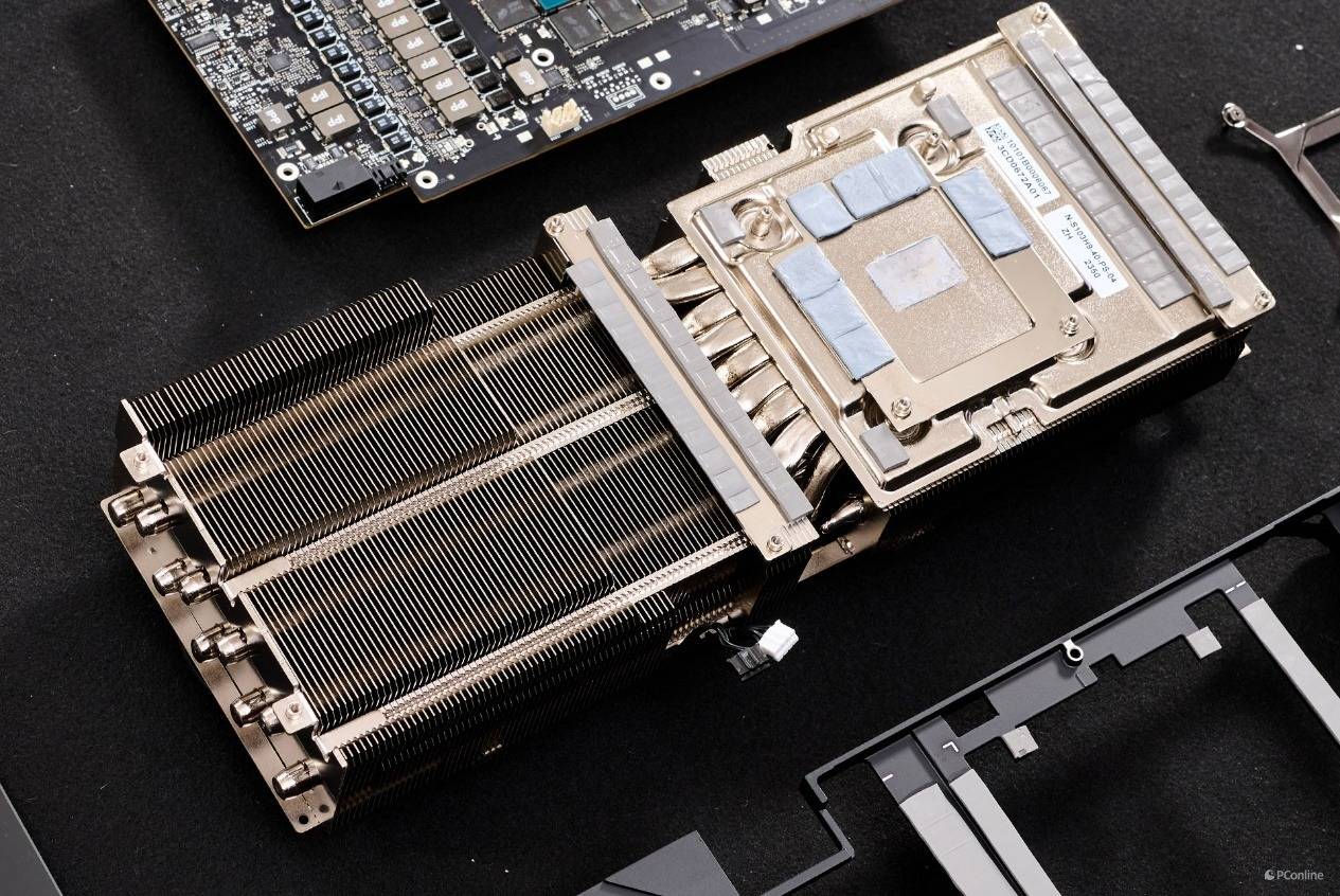 其实在散热鳍片之间还暗藏玄机,里面有9根8mm热管,贯穿整个散热器,并且直触上方的均热板,回流焊接工艺加持保证高效导热。