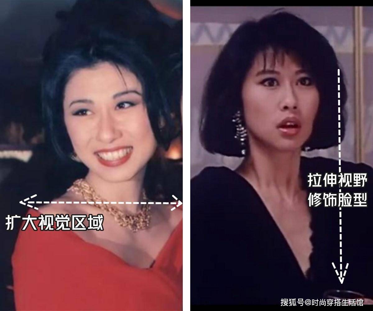 看叶倩文早年拍过的电影,很多的造型都是大V领,这和她的脸型有很大的关系,叶倩文是属于方脸,下颌骨比较的宽,大领子的衣服可以扩大视觉区域,让脸部衬托的小巧精致。