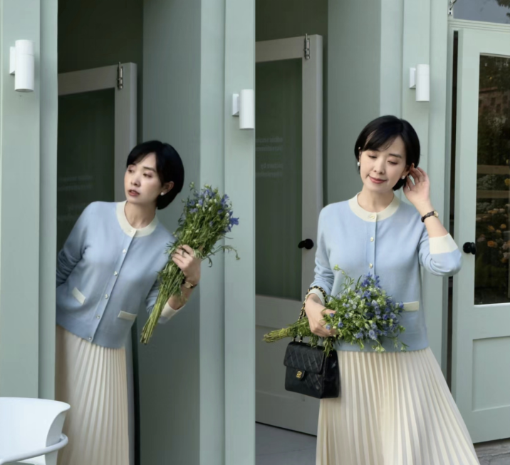 拿这件蓝色的针织开衫举例子,不管是年轻的女孩,还是步入了中老年的门槛,大家都可以无压力的尝试,总是可以构造出小清新的感觉。