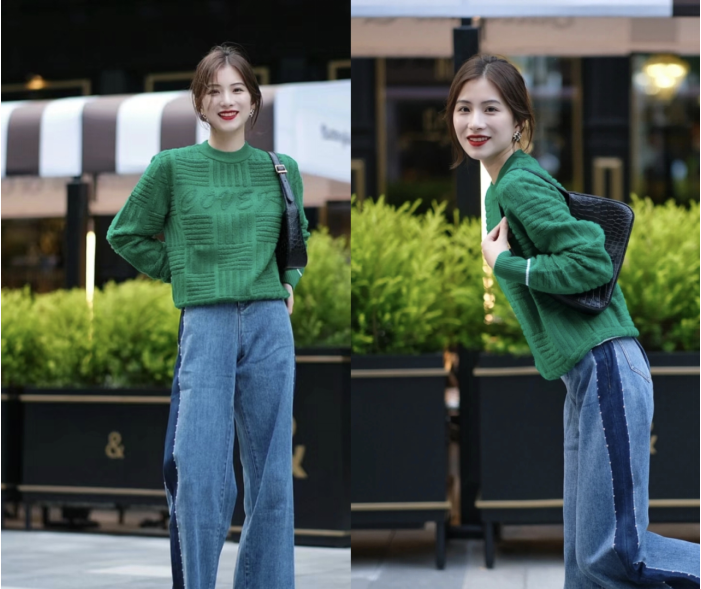 比如这件绿色的毛衣,一看就能让人感受到蓬勃的生机和无限的生命力,这种服饰就很适合匹配蓝色牛仔裤,呈现出来的着装蕴含着生动感。
