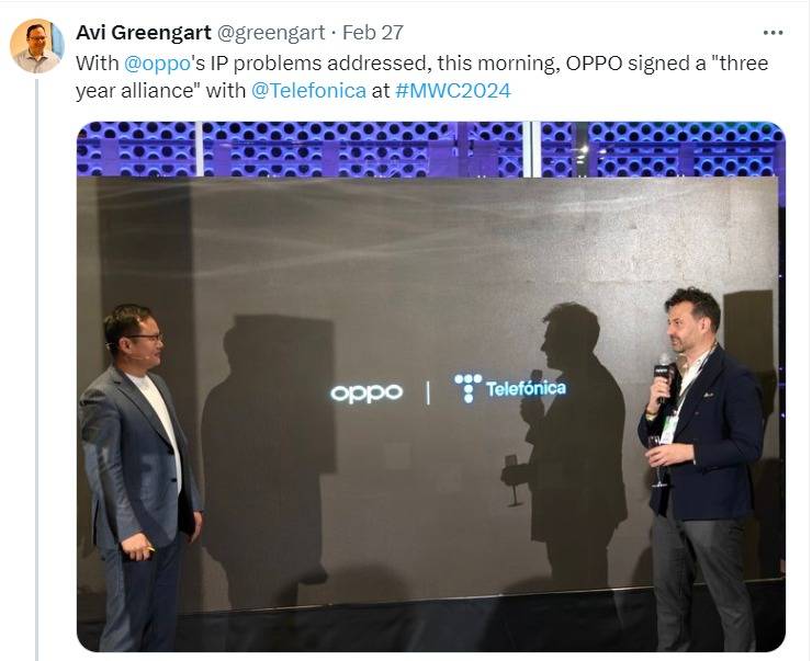 2月28日,OPPO在MWC2024活动期间宣布,与西班牙电信集团Telefonica建立为期三年的战略合作伙伴关系。此举旨在为OPPO在欧洲市场提供坚实的运营商销售渠道,从而加快OPPO在欧洲市场的回归进程。