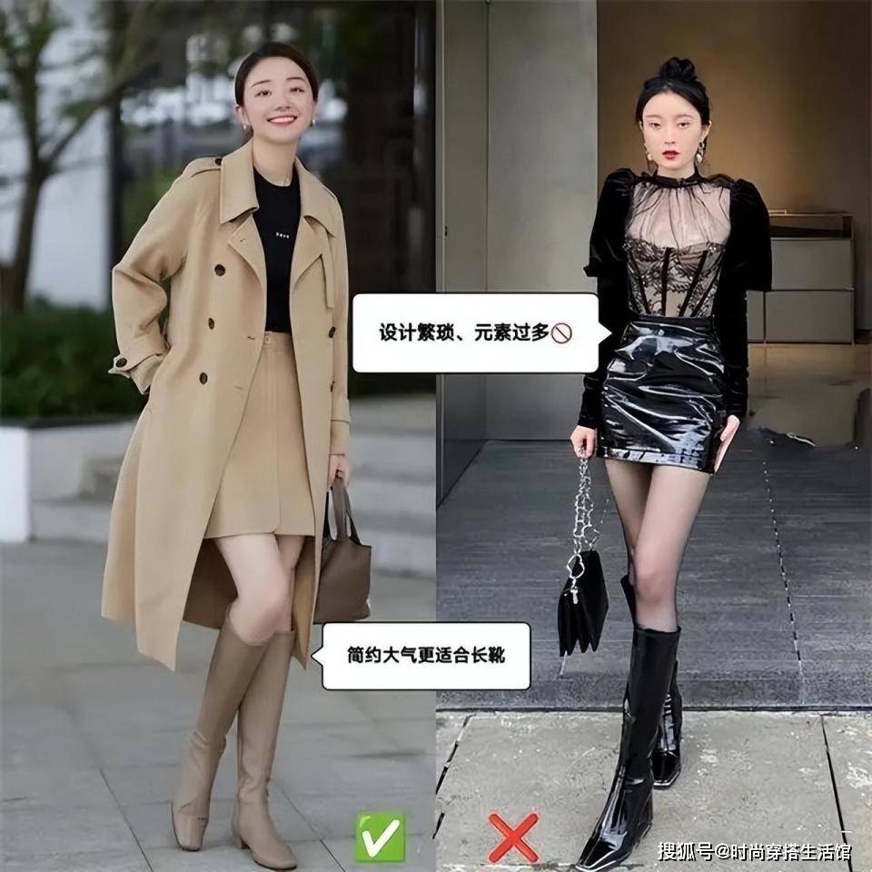 过长的靴子,比如在大腿中间这个位置的长筒靴太难驾驭。太短的靴子,靴口太浅,穿起来的保暖性差,而且也很难修饰我们的腿型,所以大家都要尽量避免。