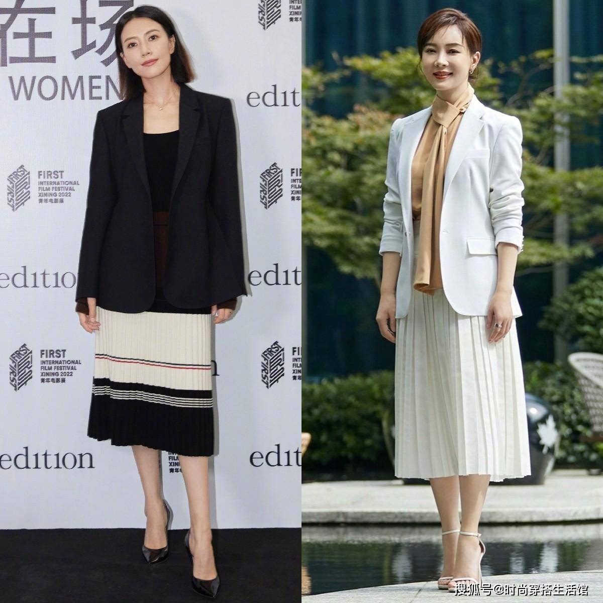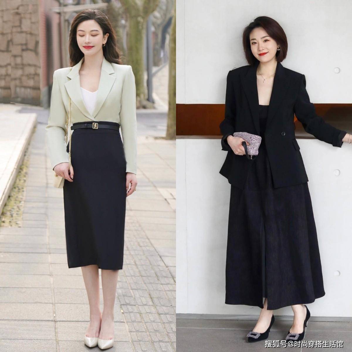 另外,除了可以用半身长裙和低跟鞋做“同色组合”,还可用“上衣+半身裙”打造出“同色系”的视感,配合经典色系的低跟鞋,同样能穿出简洁、大气的风格。