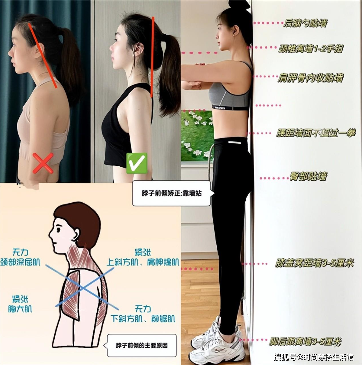 颈部肌无力、斜方肌紧张、胸大肌紧张是脖子前倾的主要原因。 要从萎缩的脖子前倾变成天鹅颈,只需要每天坚持靠墙站15分钟即可。后脑勺、肩胛骨内收、臀部贴墙是靠墙站矫正仪态的关键。