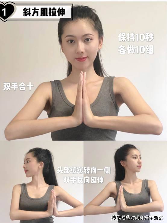 斜方肌拉伸,挺直身姿,双手合十置于身材的正前方,头部微微的转向一侧,双手向头部的反方向进行延展,慢吐慢吸,每侧保持10秒,各做10组,经常的练习这个动作斜方肌就会慢慢的变小,斜方肌的变小了整个人的上半身就会变得清瘦纤薄。