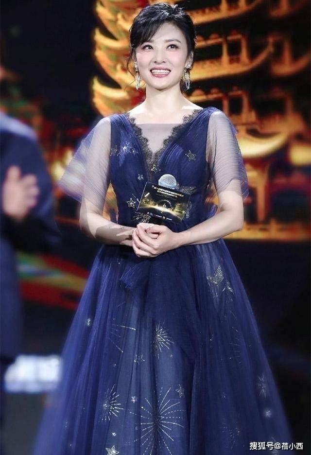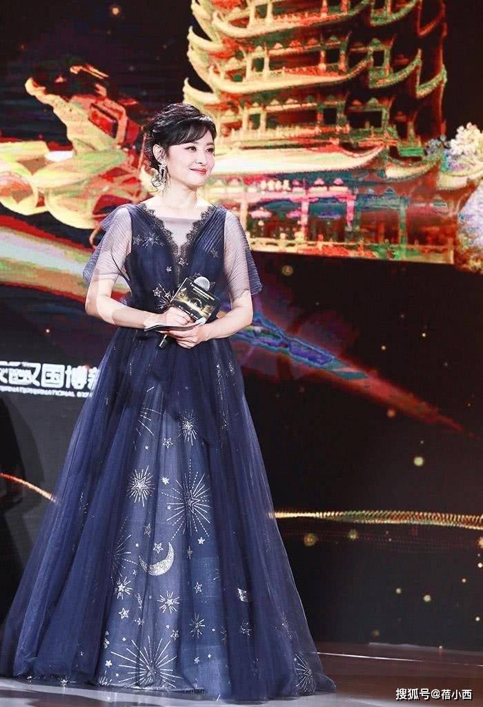 同样是礼服,红色和蓝色的感觉完全不一样。蓝色的看起来更加沉稳,少了些红色的喜庆。不过蓝色的裙子更加具有设计感,整体的风格也更加年轻,所以让周涛整个人看起来都灵动了很多,像个知心大姐姐一样。