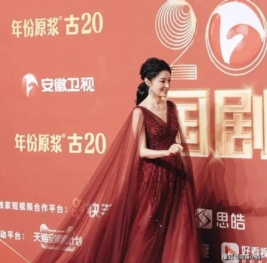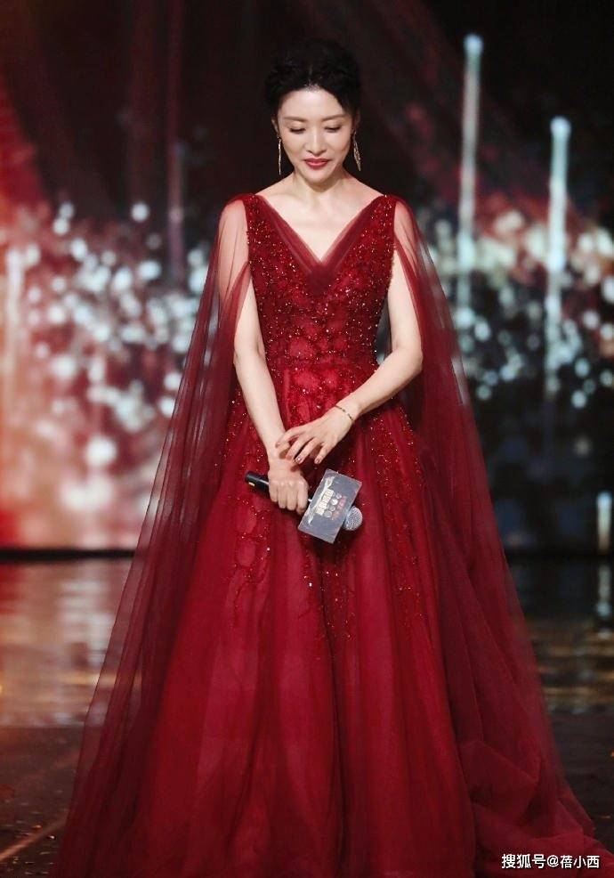 穿礼服的周涛和穿碎花裙的她,真是两种截然不同的感觉。红色是一个非常明媚的颜色,但是选不好红色也会显得老气,尤其是这种石榴红,红色调多一点,虽然整体偏暗,但是这件礼服用星星点点的碎钻在裙摆上点缀,反而看起来沉稳又大气了。
