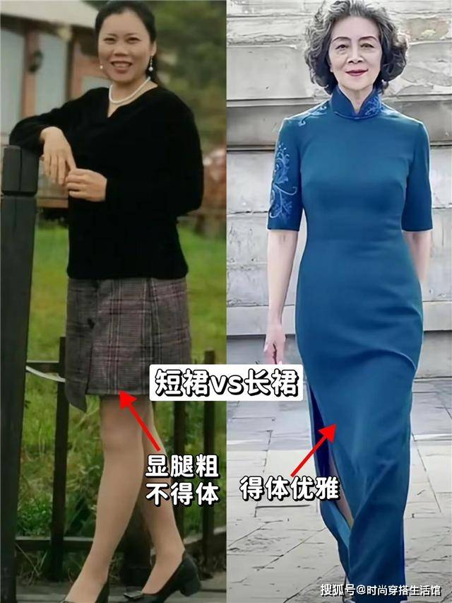 而裙长长至大腿中部或裙长刚好卡在膝盖位置的裙子,就更不行了,不仅容易暴露腿粗、腿短、腿型不好看这些身材劣势,还不符合中年女性成熟端庄的气质形象。而这,也是我为什么建议大家穿裙“裙不上膝”的根本原因。
