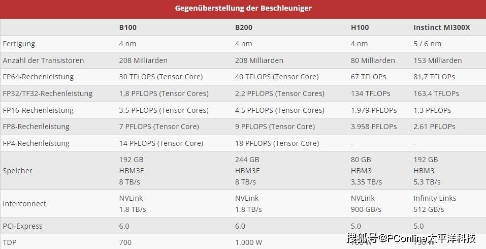 B100/B200/H100/AMD MI300X AI处理器重点参数对比 图片源自于网络