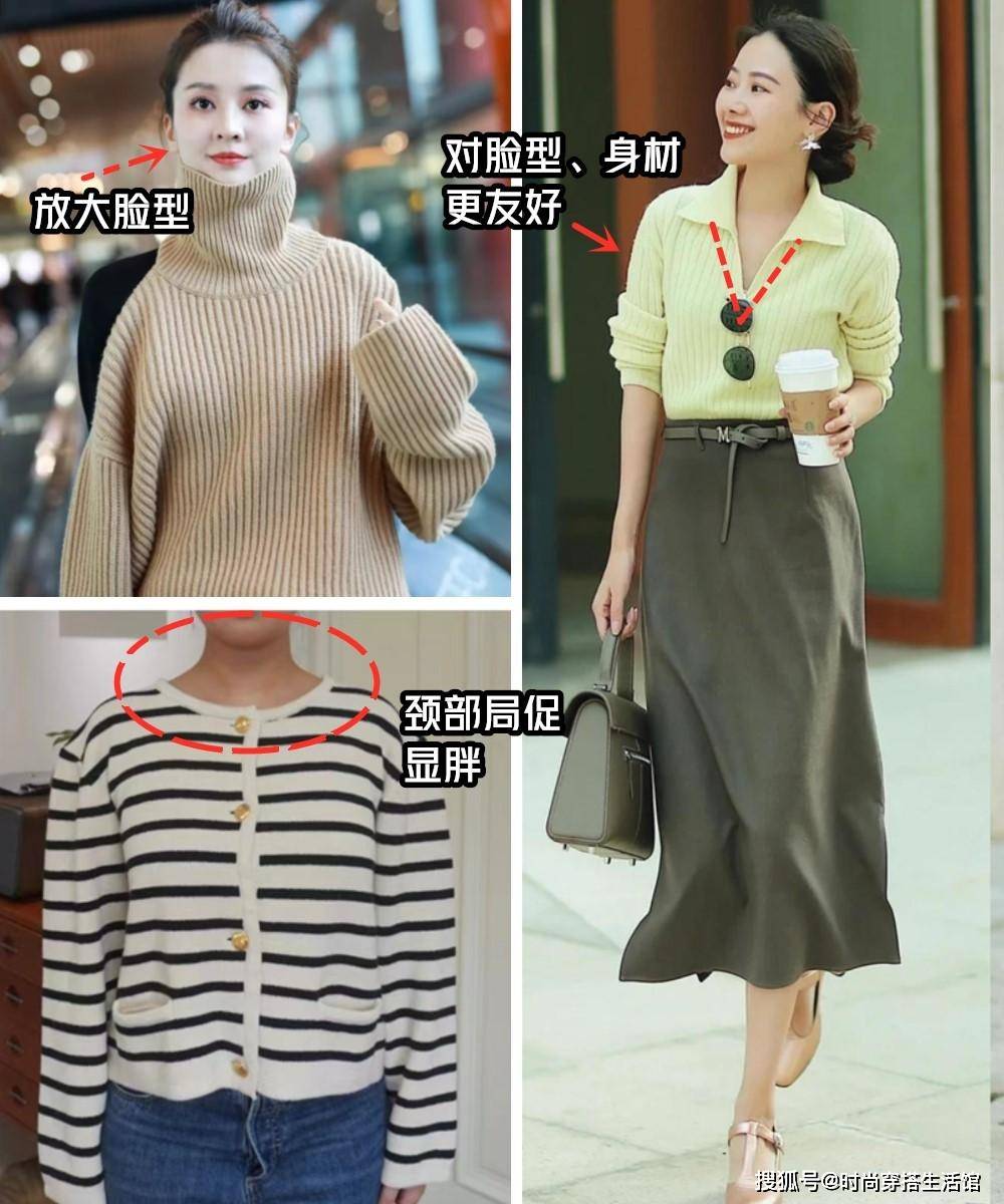 针织衫的领口大多数都是圆领和V领两种,而针对不同的身材,也需要挑选不同的领型。对于脖子短的女生而言,V领的针织衫是最佳的选择,可以增加颈部的露肤面积,在视觉上延伸颈部线条,从而营造出“天鹅颈”的效果。