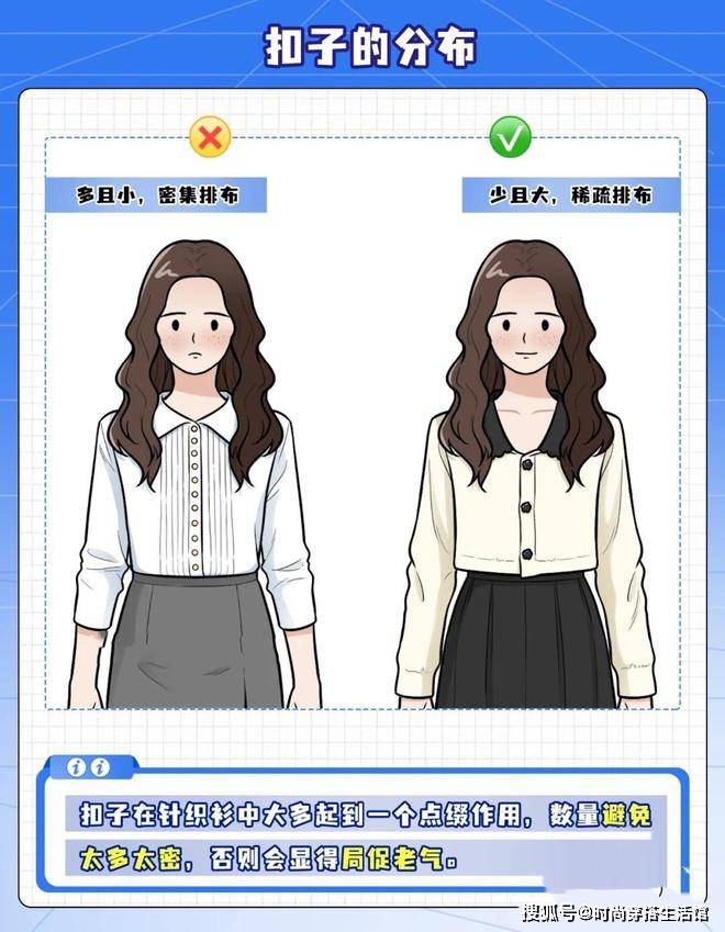 针织衫上的纽扣,还有一定的装饰效果。所以一定不要忽略针织衫纽扣的设计和大小,为了避免死板土气,一定要避开那些紧密罗列的纽扣。紧密罗列的纽扣,太死板,不够洋气。为了塑造轻盈时尚的美感,纽扣的搭配上应该秉承着少且大的原则。纽扣数量的减少,可以增加空间感,视觉上更加轻盈。大纽扣的点缀,也是非常洋气减龄的选择。