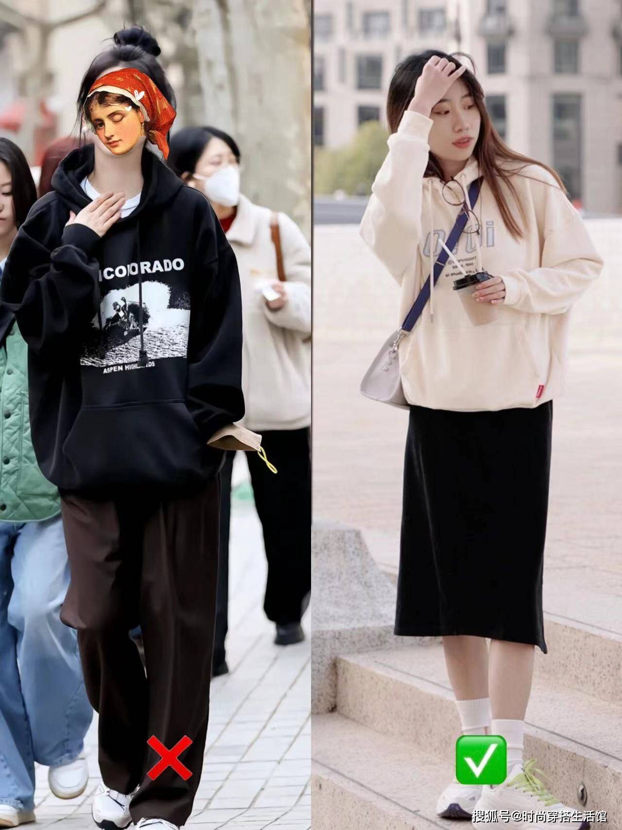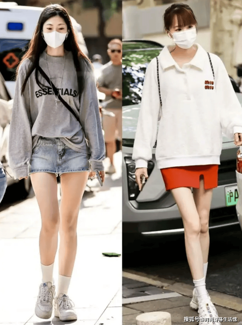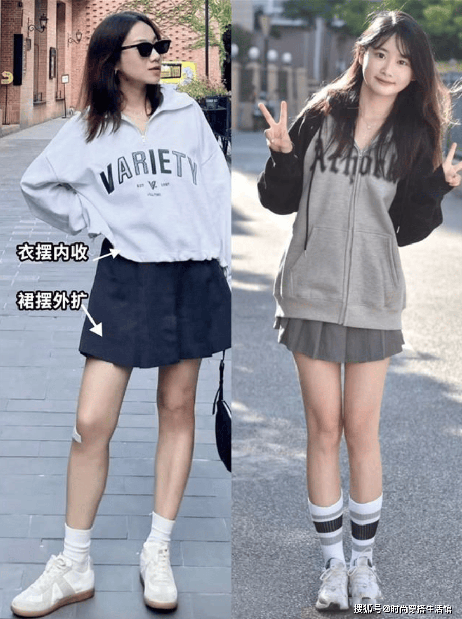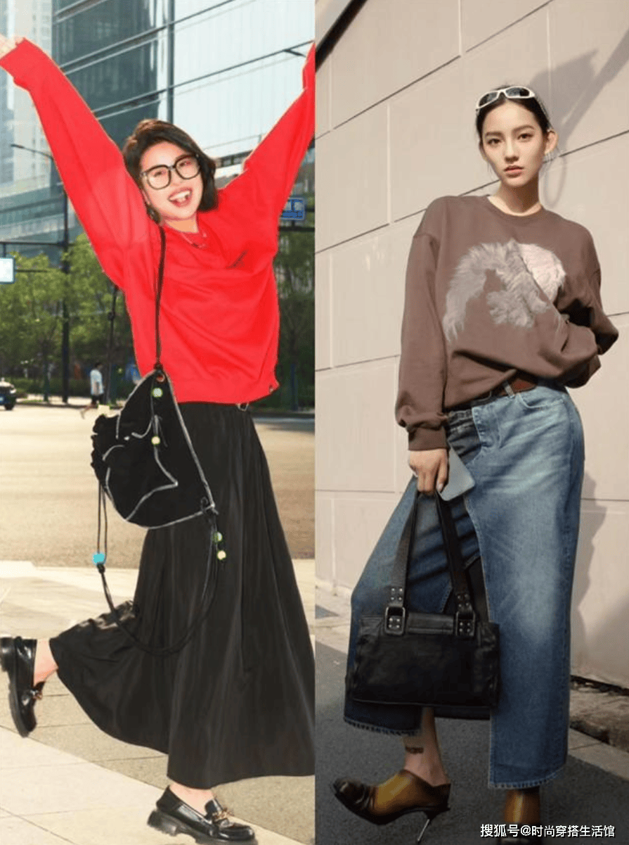 卫衣配裙子这两种单品之间的版型也要有所对比,不能上面宽松,下面也宽松,更不能上面穿得太紧身,下面也穿得很紧身,这样的极端都容易显胖。