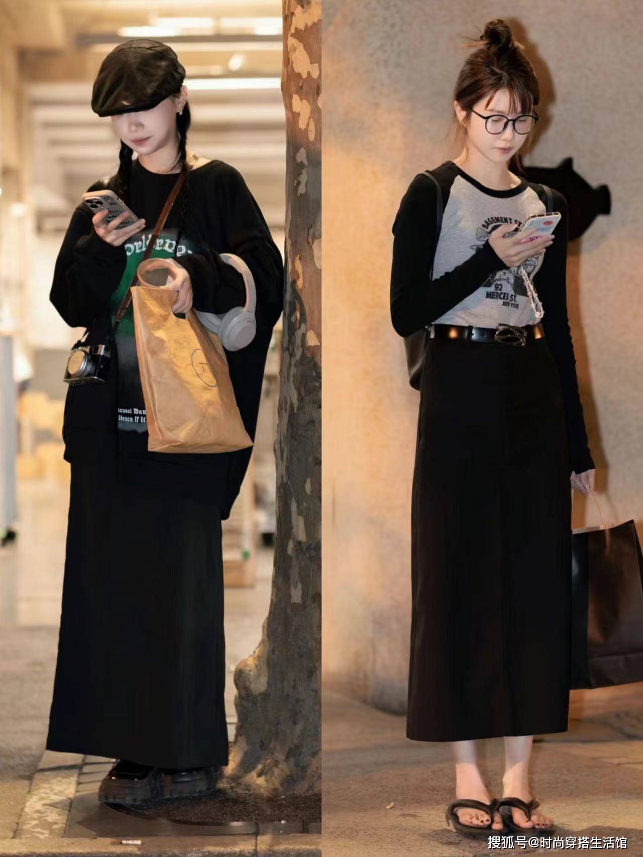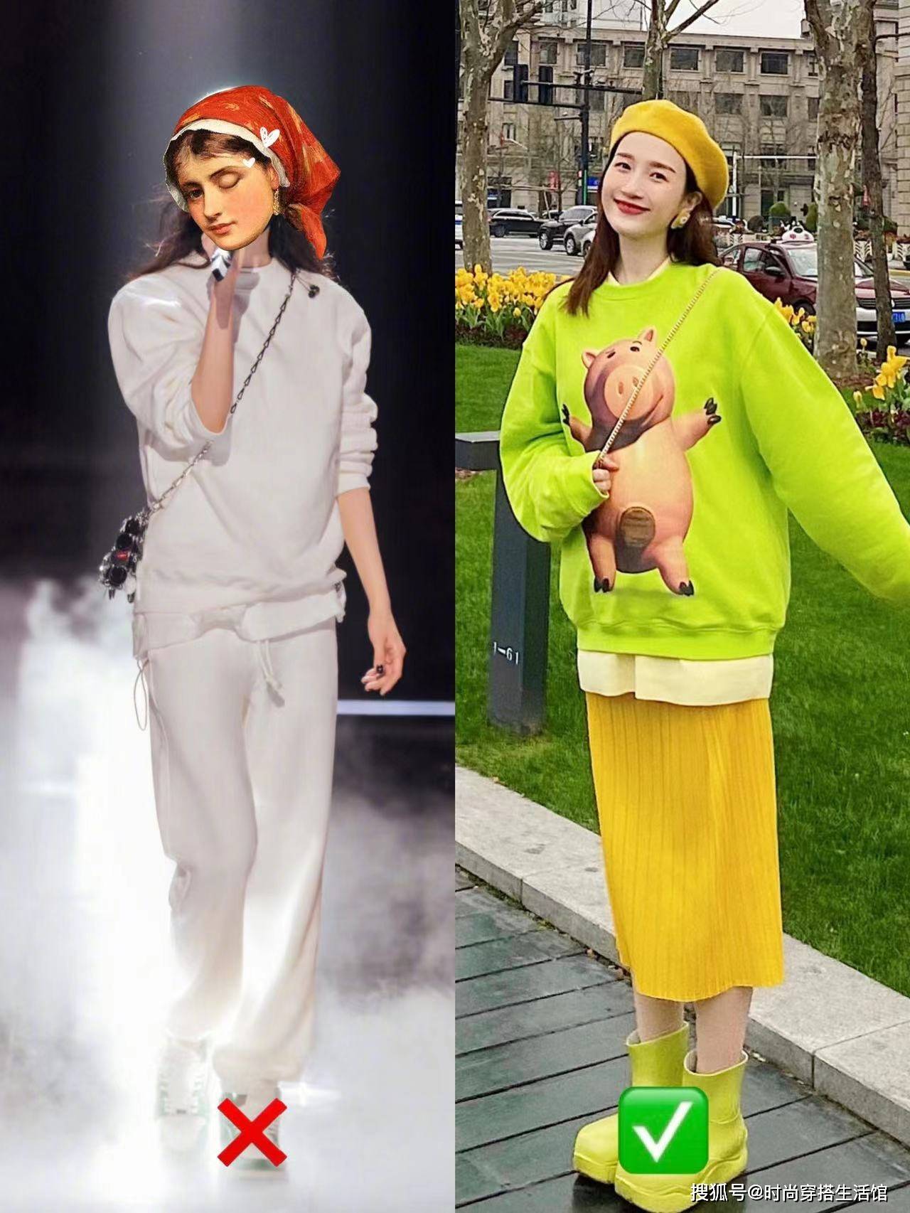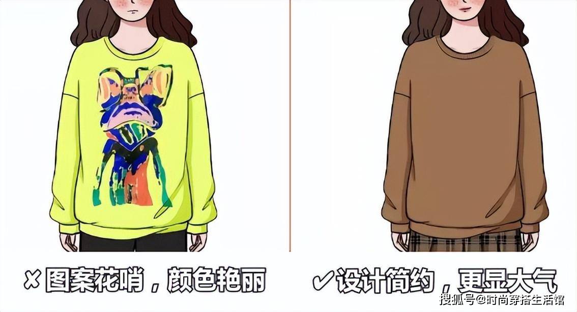 卫衣配裙子这两种单品之间的版型也要有所对比,不能上面宽松,下面也宽松,更不能上面穿得太紧身,下面也穿得很紧身,这样的极端都容易显胖。