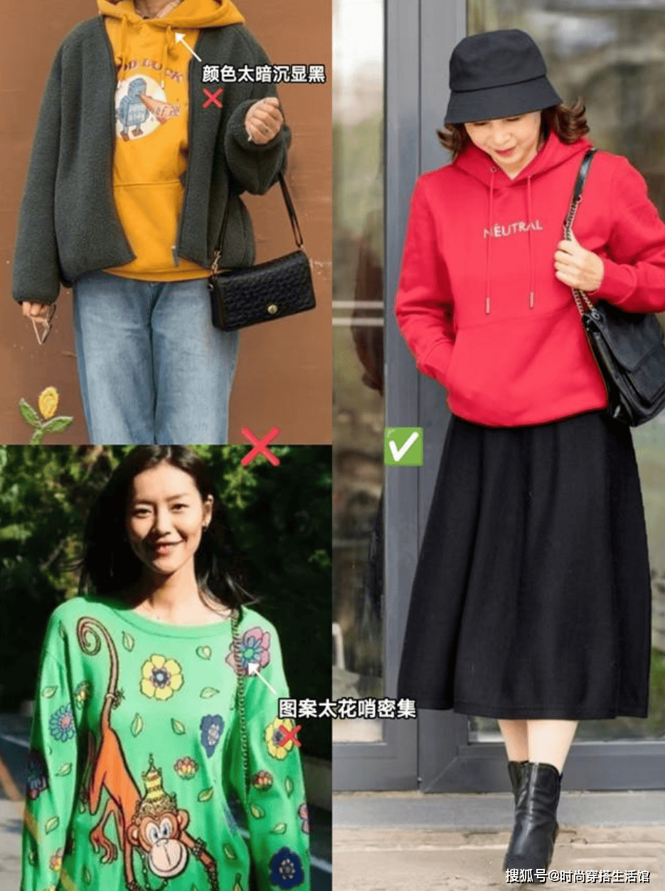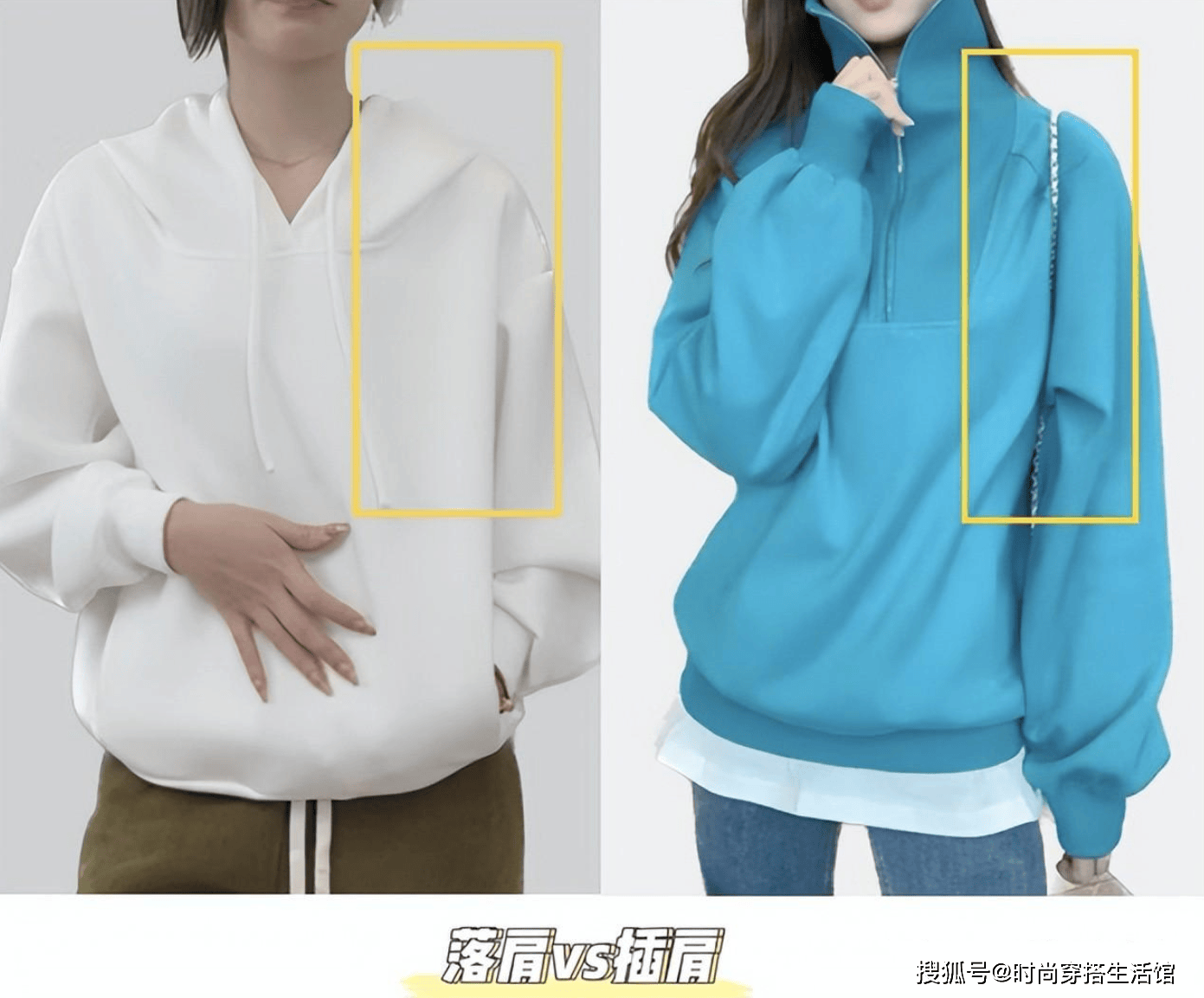 最后还要注意的就是卫衣的细节设计,比如卫衣的肩部有落肩设计和插肩设计,落肩设计更适合肩宽的女生,通过宽松肩部设计修饰上半身,营造出慵懒感,更加有利于显瘦。插肩设计的卫衣肩部剪裁立体感会强一些,更适合身材娇小和肩宽窄的女人,搭配插肩卫衣更有利于修饰头肩比。