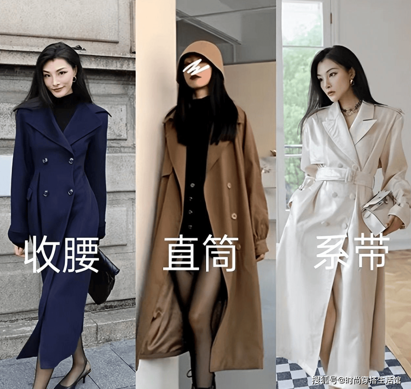 尤其是上半身偏胖的女生,带有枪挡、雨罩的风衣,过于繁复的设计显得“头重脚轻”,还会让人视线集中于上半身,显胖效果明显。款式宜简洁,这种剪裁流畅的翻领直筒版型,适合大多数身材。想要凸显身材曲线的,可以选择腰间有系带的款式,风格也更偏成熟女人