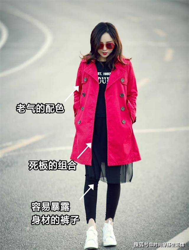 风衣配小脚裤的土气是刻在骨子里的,若是你还没有模特的身材,出众的气质,这样穿就是由内而外散发出的土气。看看上面这种玫红配黑色的老气感,毫无时尚可言的死板组合,更别说这条会暴露身材缺陷的紧身小脚裤了,哪哪都是雷区的搭配还穿它做甚?