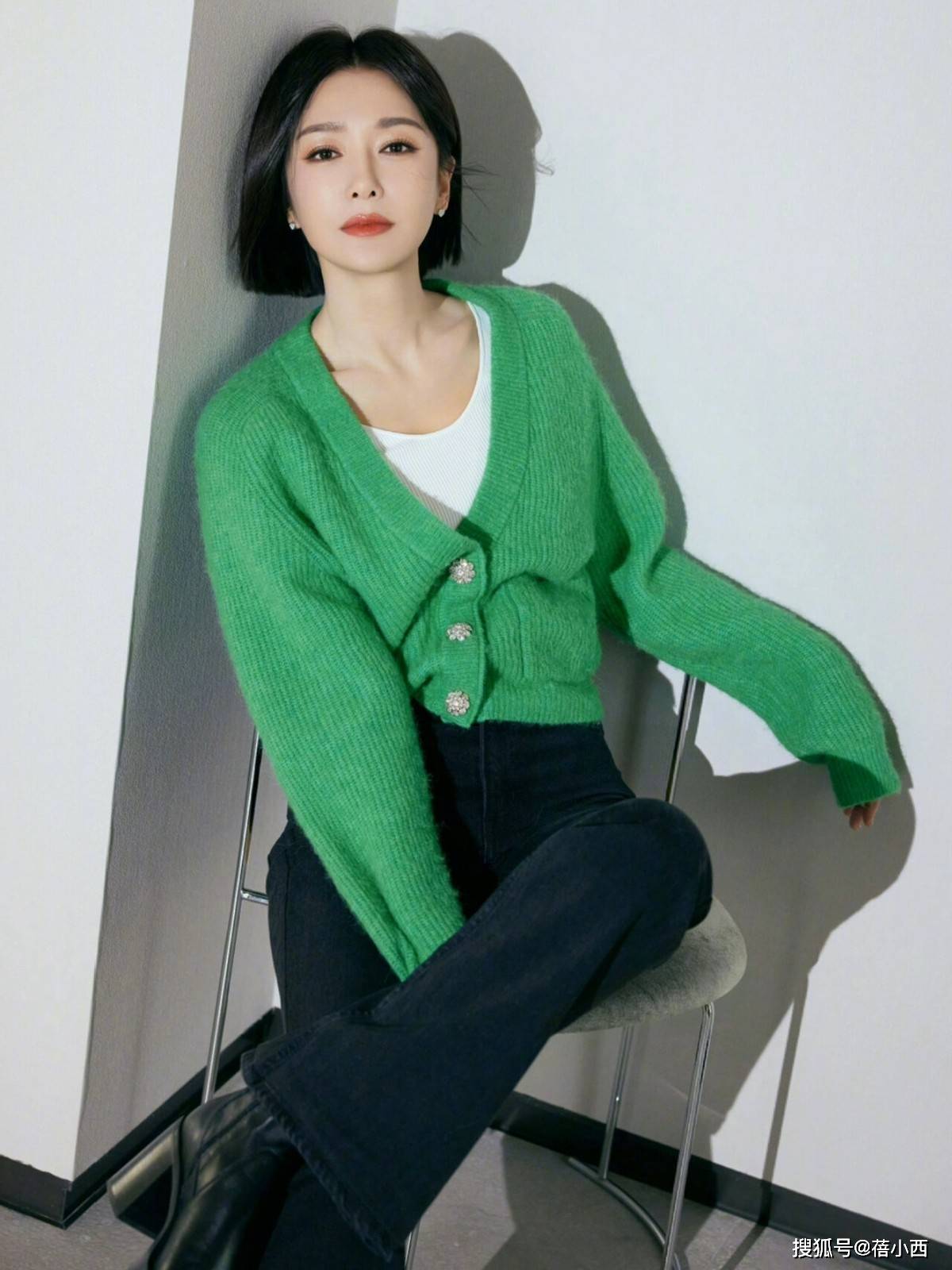 针织衫的领口比较低,所以一定要在里面搭配上一件内搭,你可以跟秦岚一样选择T恤搭配在里面,用白色T恤和绿色针织衫叠加起来,既能够展现层次感,而且也比较的保暖。