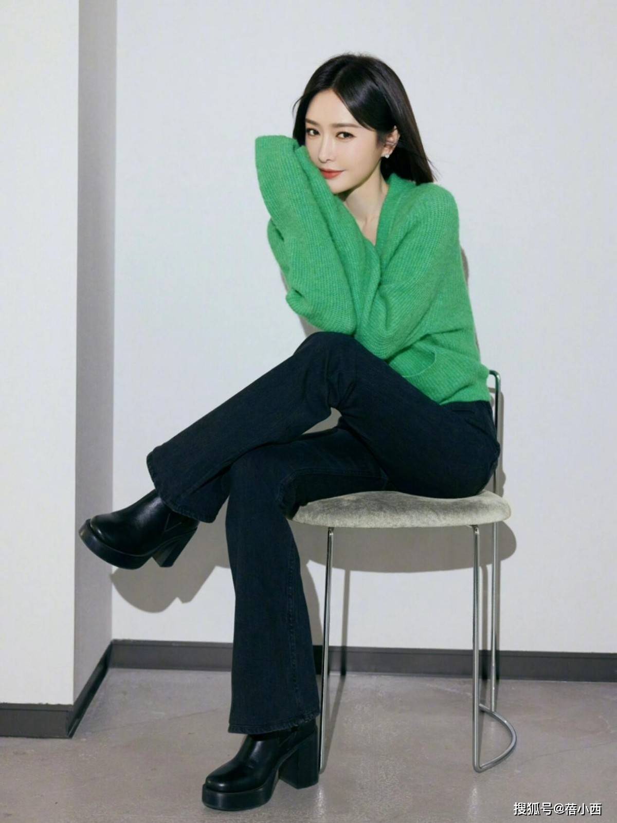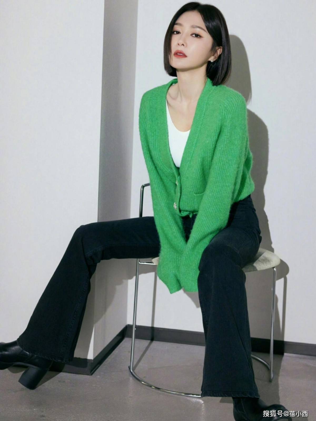 在春天的时候,针织衫已经成为了人手必备的单品,当你在穿春装时,你都可以先考虑一件合身的针织衫以展现出时尚感,而这一次的秦岚选择绿色针织衫,这件针织上衣穿在她身上也相当的时髦,绿色针织衫显得清新脱俗,而且也衬得皮肤更白。