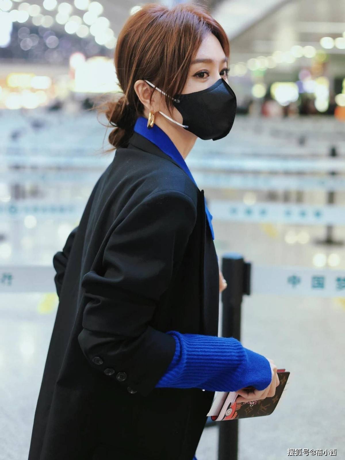 秦岚很喜欢尝试各种混搭,下面黑色西装和宝蓝色针织衫的叠穿搭配也体现出了她的时尚感,这一件蓝色针织衫穿在里面显得时髦个性,混搭黑色的西装又能避免过于花哨。
