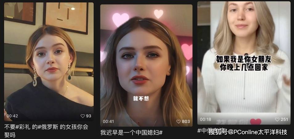 视频号上的情况又有些不同。这里的AI网红大多是“国际友人”——一位俄罗斯美女用些许生硬的中文,诉说着自己想要嫁到中国的愿望。浓厚的滤镜让PConline编辑室全体疑惑:“这会有人信吗?”
