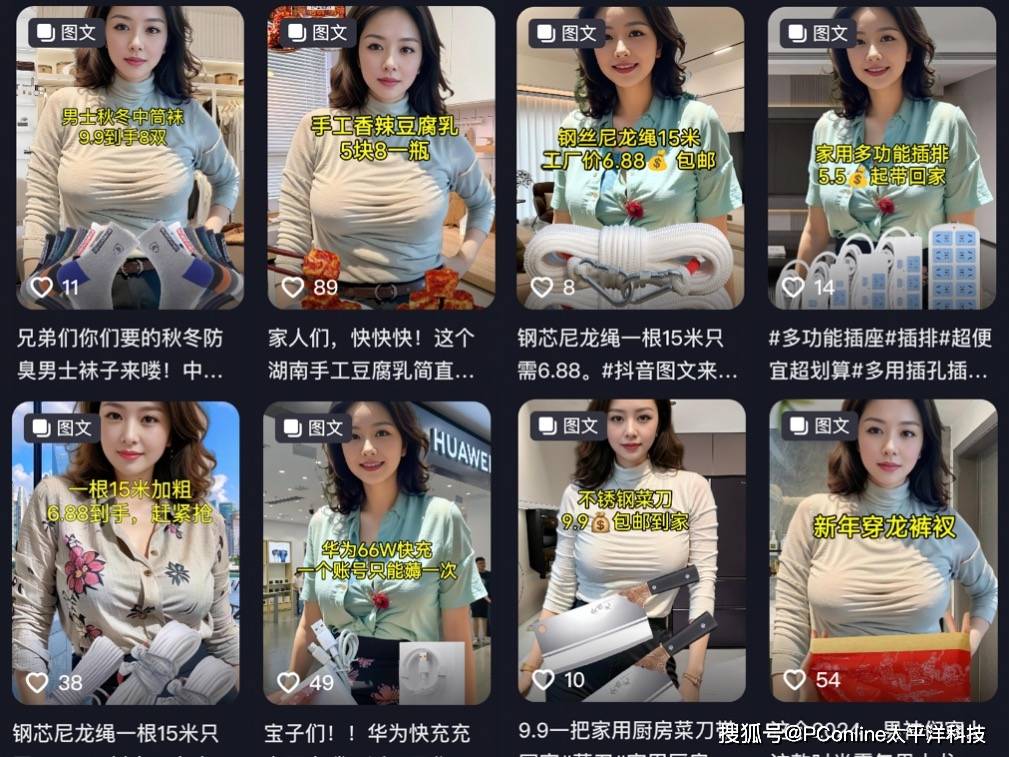抖音上一个名叫“小姨妹”的博主,每条视频都带不同的产品,价格一般在10元以内。封面图是AI生成的美女加上几行产品介绍。如此简单的内容居然收获了110.5万的粉丝!