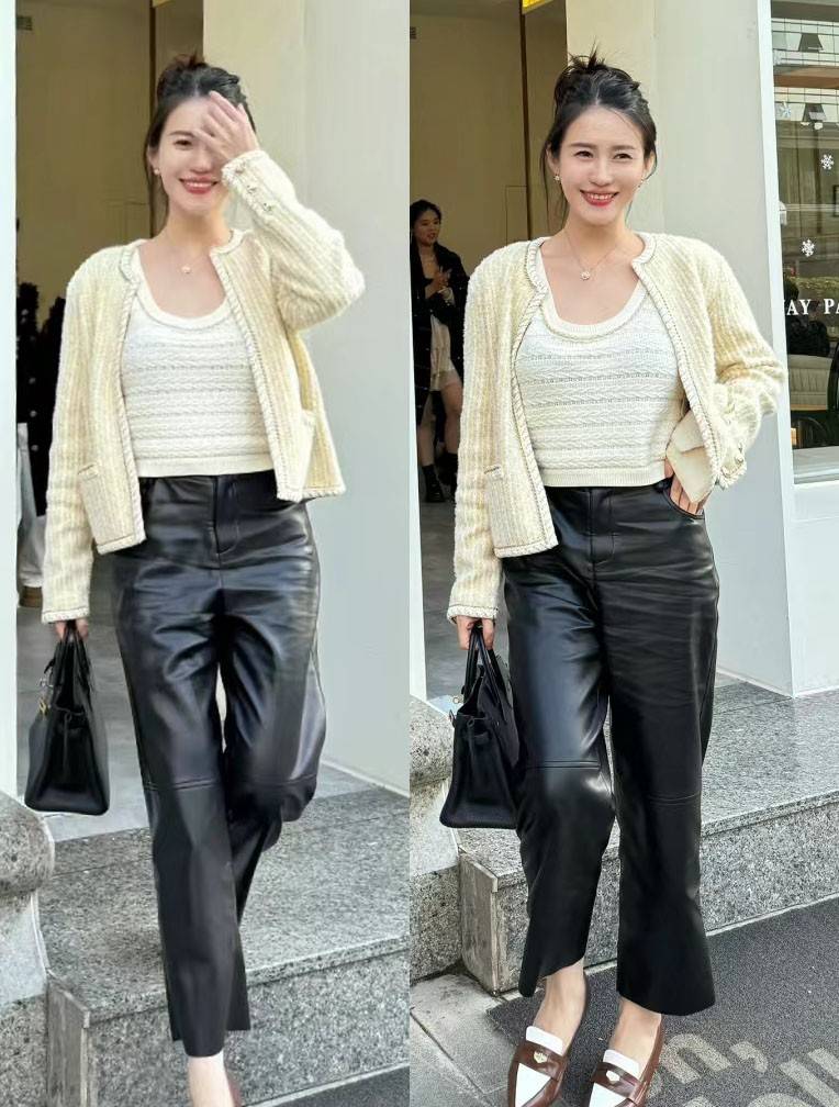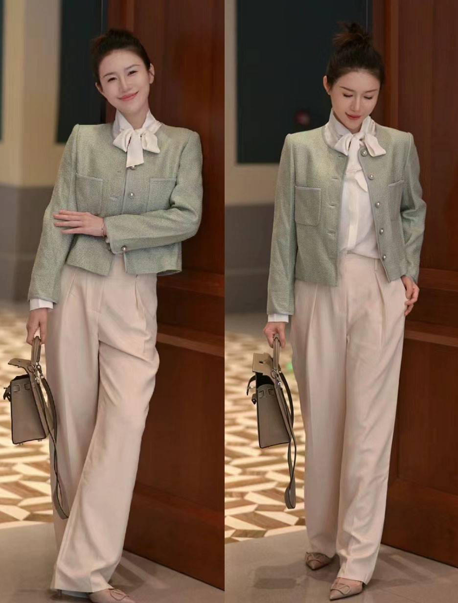 像上图这位女士,她采用的就是一件小香风外套与同色系微喇裤,两者在色调上的相互呼应,与版型上的协调搭配,都是凸显女士高雅气质的关键。