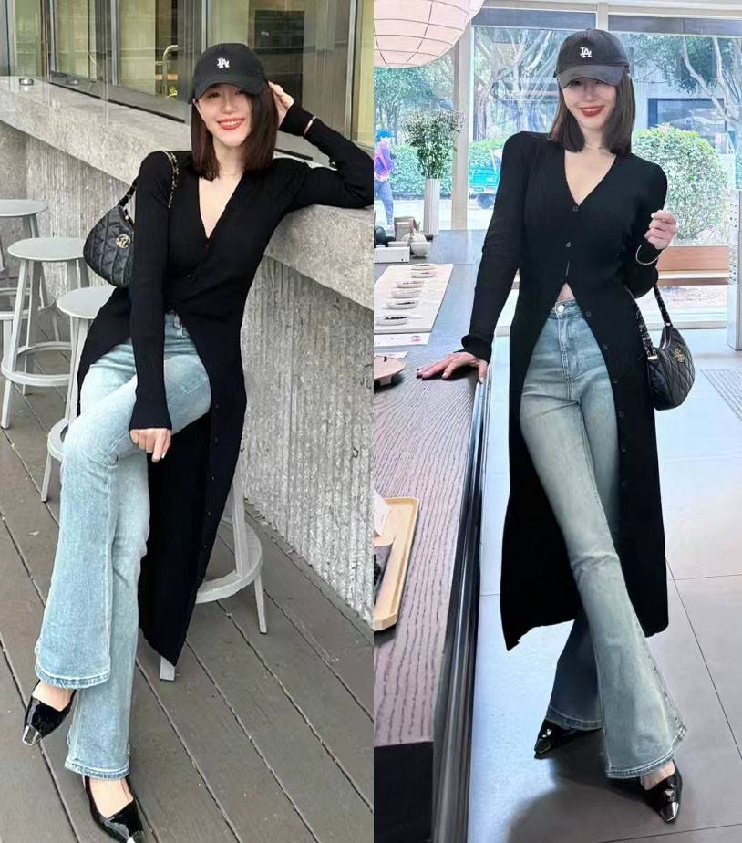 蓝色与上装的结合频率是比较高的,但是与下装设计到一起时,大部分人当然会首先选择牛仔裤。像上图这身穿搭中采用的就是牛仔喇叭裤,在视觉上展现出了具有曲线感的身材,时尚又显女人味。