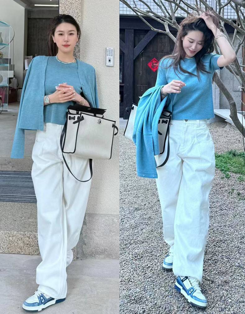 例如上图这位女士的造型中,就主要应用了两种色调,一种是蓝色的上搭,另一种则是白色的阔腿裤,两者结合之下,尽显自然而然的时尚格调,看上去澄澈又清亮。