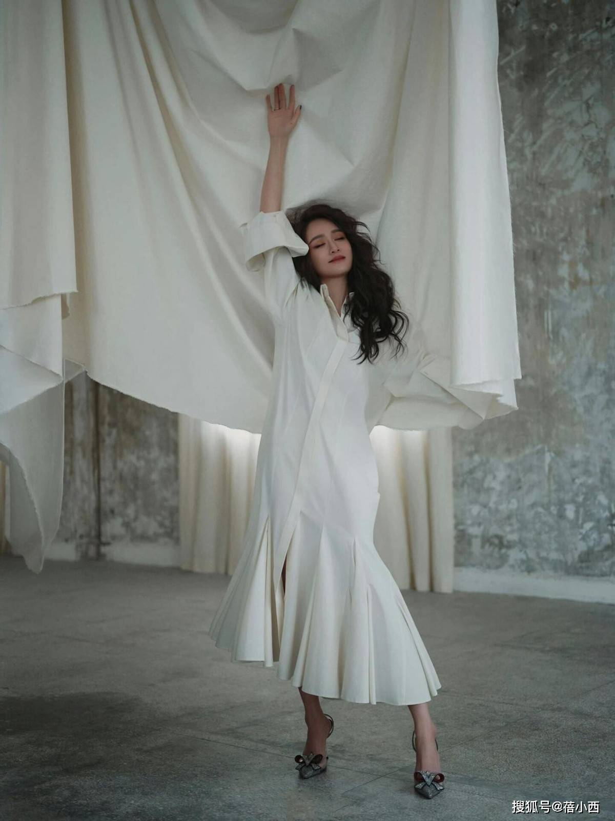 白色衬衫裙往往象征着极致的纯洁,而且带着休闲和随意感。陈乔恩的这件白色衬衫可以说是很有设计感了,裙子前段中规中矩的设计非常呆板,甚至可以说是没有创意,但是到了衣摆最下面却设计了一条鱼尾,是不是突然就让人眼前一亮呢?