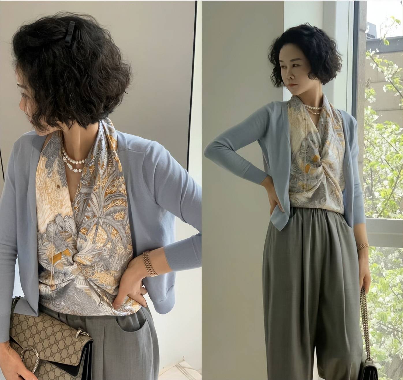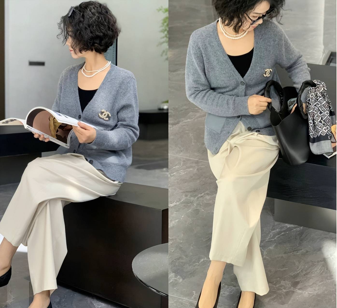 像这一组穿搭,运用到的就是珍珠项链的点缀,这种饰品其实可以让成熟女性的优雅风采得以明确的释放,佩戴起来也便捷。