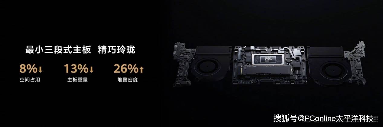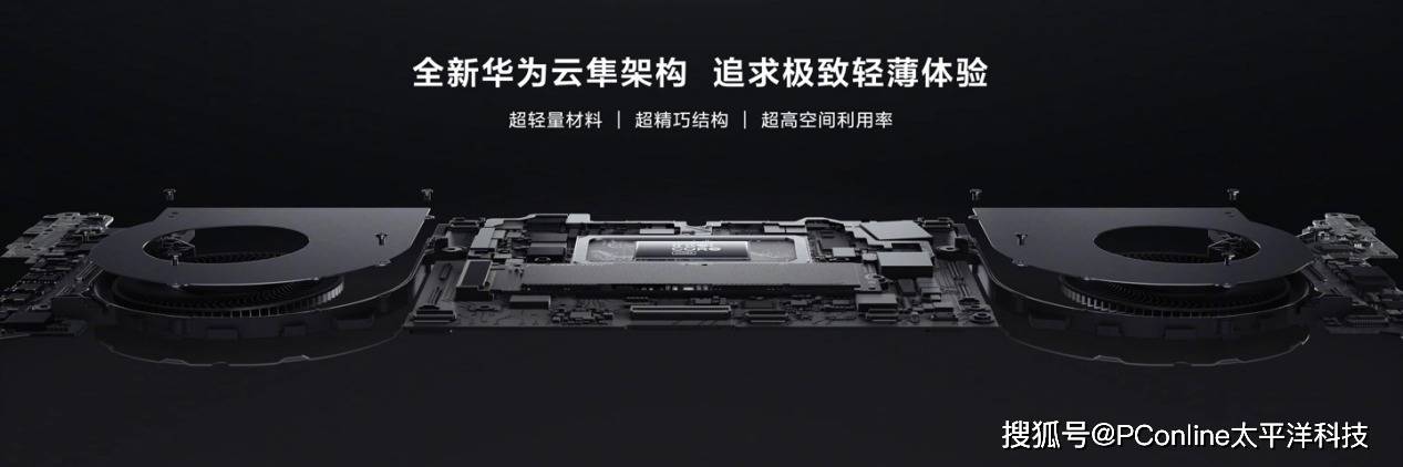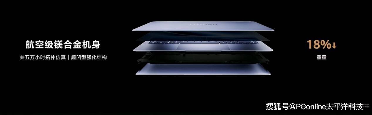 其采用了航空级镁合金机身,经过五万小时拓扑仿真,超凹型强化结构,让重量下降了18%;同时机身设计采用了华为自研的全新云隼结构,机身内部由超轻量材料打造,主板为小型三段式主板设计,提高空间利用率的同时降低重量、提升堆叠密度,首创的金刚铝材料,提升了内部强度也减轻了重量。经过了设计、材料、结构等多维度的设计与创新,使得这台MateBook X Pro的重量控制在了1KG以内。