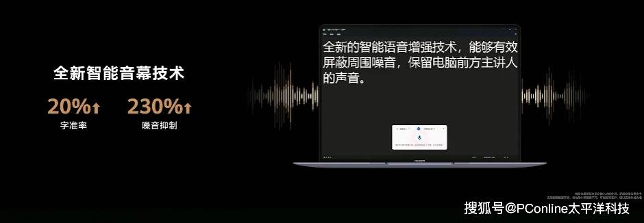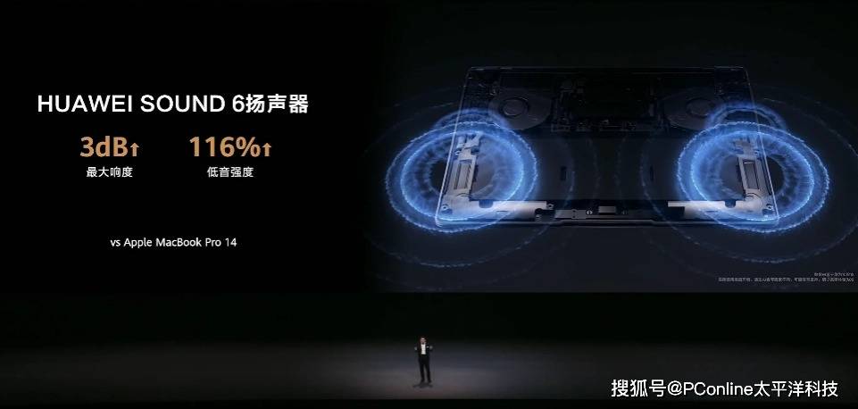 在其他周边配置方面,华为MateBook X Pro拥有全新智能音幕技术,字准率提升20%,噪音抑制230%,并且配有HUAWEI SOUND 6扬声器,与苹果MacBook Pro 14相比,最大响度提升3dB、低音强度提升116%,在嘈杂环境下也能提供优秀的视频会议体验。