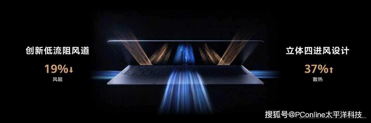 如此轻薄的机身下,性能释放并没有因此妥协,在最高搭载Ultra 9处理器的情况下,创新的低流阻风道与进风设计+拥有首款AI仿真设计扇叶的流线型增压双风扇,华为MateBook X Pro可以达到40W的高性能释放,作为对比,1.61KG的苹果MacBook Pro 14仅有38W。