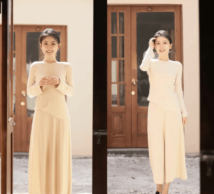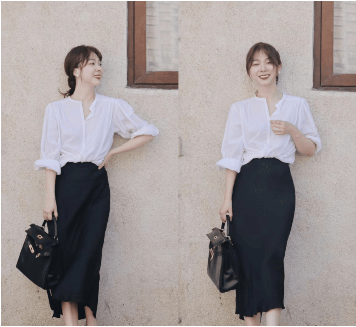 这套穿搭其实适合身材没那么出众的女性,下半身采用的裙子不是包臀的设计,但带有高腰线的加持,同样可以刻画出好看的线条。