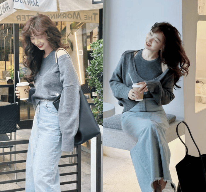 这套穿搭可以让女性的整个锁骨曲线得到一个清楚的透露,合适的服装领口的加入,有利于打造出显瘦显身材的效果。