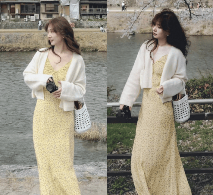 开衫和连衣裙的搭配,其实也是符合当下温度的一种穿搭方式,利用开衫展现出温柔的气息,借助裙子,也可以打造出很飘逸很仙的形象。