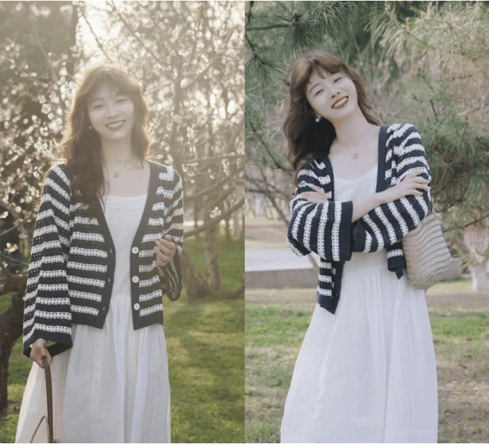 在选用开衫的时候,每个人的想法是有一些不同的。像这款黑白条纹开衫,款式方面的形成不会单调,可以搭配清爽的白色裙装,而演绎出很简约的画面。