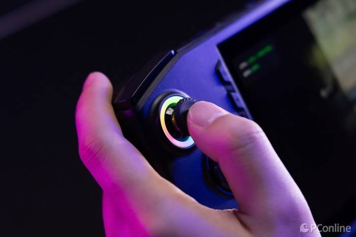 正面摇杆处的360度RGB灯带,以及RGB按键点缀了这台纯黑色的掌机,提供了一些赛博科技感。