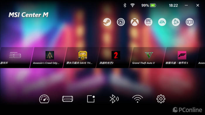 考虑到有些用户可能会对用手柄操作Windows系统界面感到不便,微星提供了MSI Center M界面,它可以被看作微星Claw掌上游戏机核心系统的界面。这个界面类似于PS5等主机的系统主页面,包含了游戏目录,还有像Wi-Fi、场景、蓝牙等功能的快捷方式,方便手柄操作。