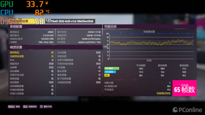 《极限竞速:地平线5》的帧数和体验也不错,720P 低画质可以65FPS流畅运行,最低帧能接近60FPS,说明游戏优化的确实不错。