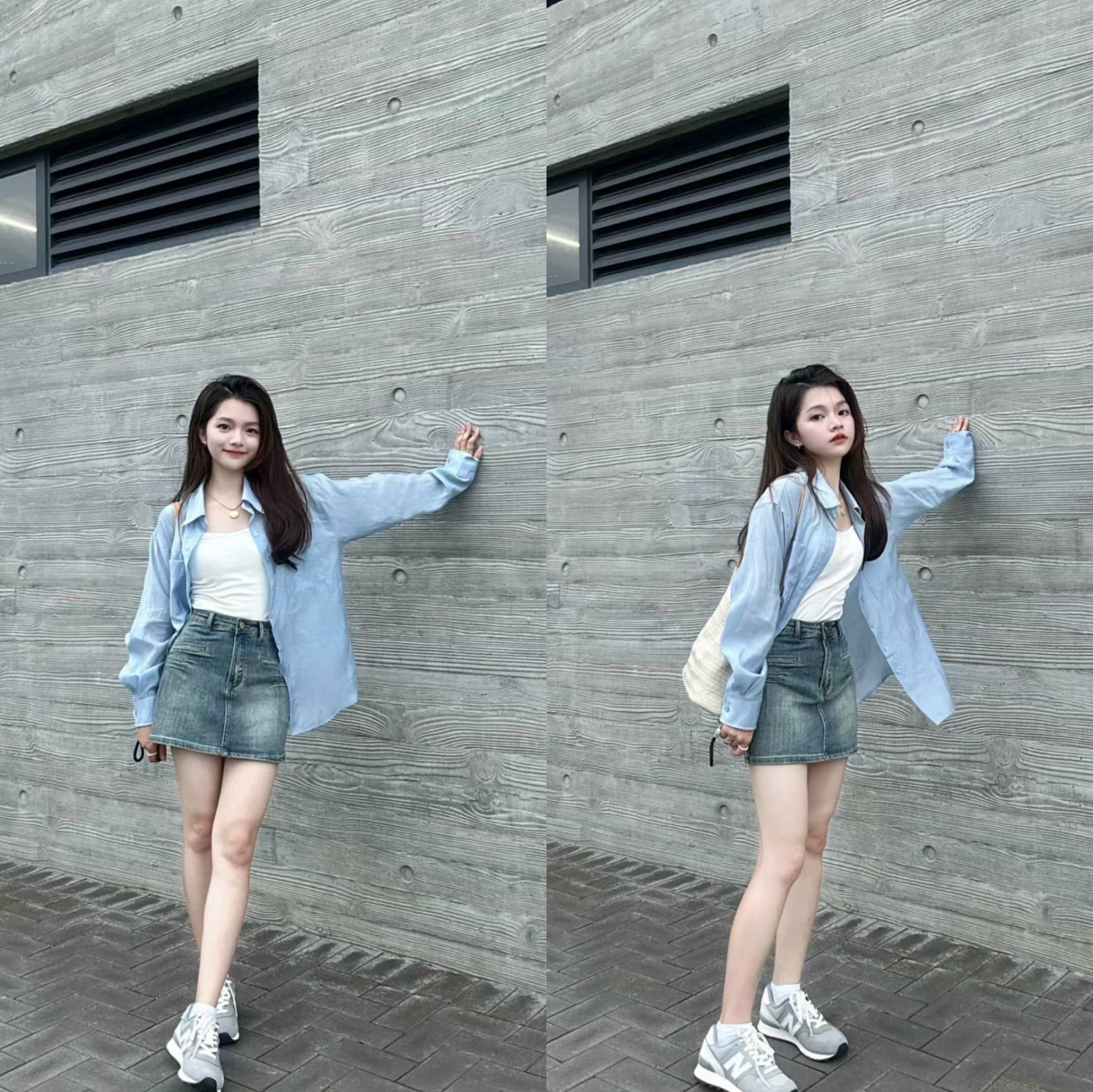 牛仔短裙对小个子也非常友好,将白色内搭下摆塞进裤腰,就能凸显高腰线,让整个人在视觉上显得特别苗条,蓝色衬衫加持,凸显更加完美的身材比例。